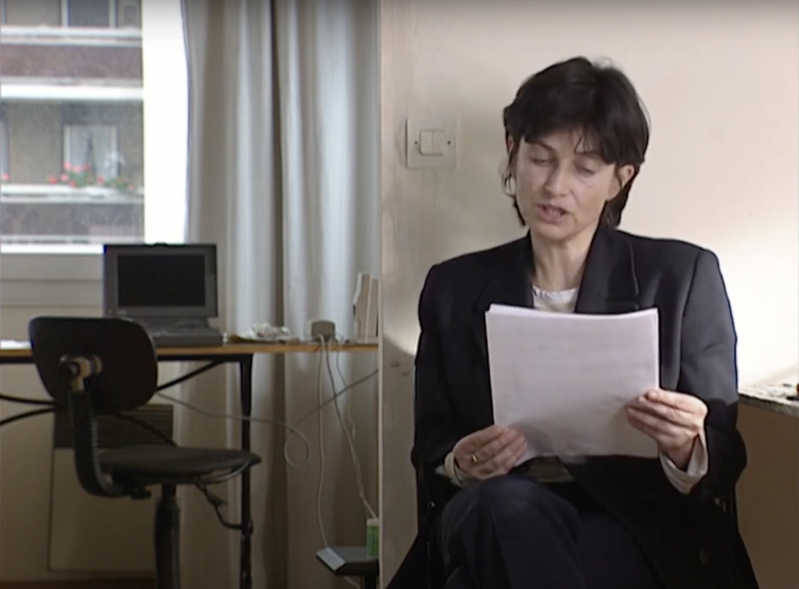 The repetitive structures, extended durations, and immobility in Akerman’s films and installations are more often commented on than her taste for departure and movement. Yet the hold of the banal and the paralysis of daily life and routine are inseparable from what blows them apart: Saute ma ville. Let’s not forget that one of the first titles for what would become Jeanne Dielman was Elle vogue vers l’Amérique [She Sails toward America]. But to be satisfied with thinking of the filmmaker’s modern adventure as the narrative of a constant back and forth between inside and outside, coercion and liberation, oppression and emancipation, would be to miss the experience it offers. In an illuminating short essay, Giorgio Agamben warns against understanding the word ‘adventure’ only through its romantic distortion.3 Before ‘adventure’ referred to an extraordinary series of events or the path of someone’s destiny, the medieval texts conflated it with the form of the poem that related its episodes. Adventure must then be understood as the location of a coincidence between ‘events and tale, between facts and words’: the adventure is the poem.4 Akerman’s modernity is probably also due to her deliberate anti-romanticism, according to which form is not the lyrical expression of content but a sometimes difficult experience that requires the viewer to make a perceptual adjustment, as if the screen were an interface with its own set of sometimes blinding rules, of which the primary ones are those of perspective.5 When viewing an Akerman film or installation, one must accept the adventure of perception to access the one that is shown or told. The best example is the mise-en-scène in Là-bas, in which the film-maker travels to Israel to lock herself up in a room in Tel Aviv and film at great length a neighbouring building through the horizontal grid of its Venetian blinds, while speaking off screen about her daily life and her familial, reflexive relationship to the country’s history. The framework of the blinds replaces the narrative framework: nothing happens and yet the image is ‘riddled with events’6 as insignificant as they are loaded with resonances by the situation and the voice. In Akerman’s most beautiful works, the modern adventure is literally this concretion of meaning in form, which Giorgio Agamben refers to as ‘poetic truth’.7